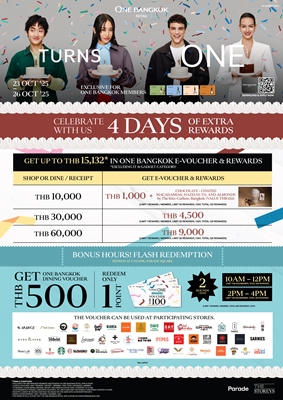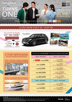 สำหรับแคมเปญ “TURNS ONE” ได้จัดขึ้นระหว่างวันที่ 1 ตุลาคม ถึง 13 พฤศจิกายนนี้ โดยรังสรรค์ทั้งโปรโมชั่นสุดเอ็กซ์คลูซีฟควบคู่กับกิจกรรมความบันเทิงมากมาย เพื่อมอบประสบการณ์เหนือระดับที่มากกว่าการช้อปปิ้ง โดยลูกค้าจะได้พบกับของรางวัลมูลค่ารวมกว่า 20 ล้านบาท ไม่ว่าจะเป็น One Bangkok E-Voucher มูลค่าสูงสุด 30,900 บาท, แคมเปญพิเศษสำหรับ Top Spenders, สิทธิพิเศษ Buy 1 Get 1 Free จากร้านอาหารชื่อดัง รวมถึงกิจกรรม Lucky Draw ที่มอบรางวัลใหญ่มูลค่ารวมกว่า 10 ล้านบาท อาทิ Mercedes-Benz GLC 220 d 4MATIC Avantgarde Diesel 2 มูลค่า 3,720,000 บาท และแพ็กเกจท่องเที่ยวสุดหรู