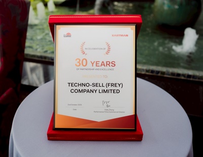 นางสาวจันทร์นภา สายสมร ประธานเจ้าหน้าที่บริหาร บริษัท เทคโนเซล (เฟรย์) จำกัด ผู้นำเข้าและจัดจำหน่ายฟิล์มกรองแสงรถยนต์และอาคาร “ลามิน่า” ฟิล์มกันสะเก็ดหินและฟิล์มกลุ่มพิเศษ “ลูมาร์” จากสหรัฐอเมริกา รับมอบโล่เกียรติคุณฉลองครบรอบ 30 ปีแห่งความร่วมมือระดับดีเลิศจาก อีสท์แมน เพอร์ฟอร์แมนซ์ฟิล์ม ประเทศสหรัฐอเมริกา โดยมีผู้แทนคือ นายณัฐนันท์ ลอยฟ้า Strategic Branding and Marketing Manager นายไว ไว ฉิว Account Manager และ นางสาวสเตฟานี ลก Sales Manager ร่วมประกาศขับเคลื่อนความสำเร็จของพันธมิตรธุรกิจที่เติบโตไปด้วยกันอย่างยั่งยืน ตอกย้ำความเป็นแบรนด์ฟิล์มกรองแสงอันดับ 1 ในเมืองไทยอย่างแข็งแกร่ง