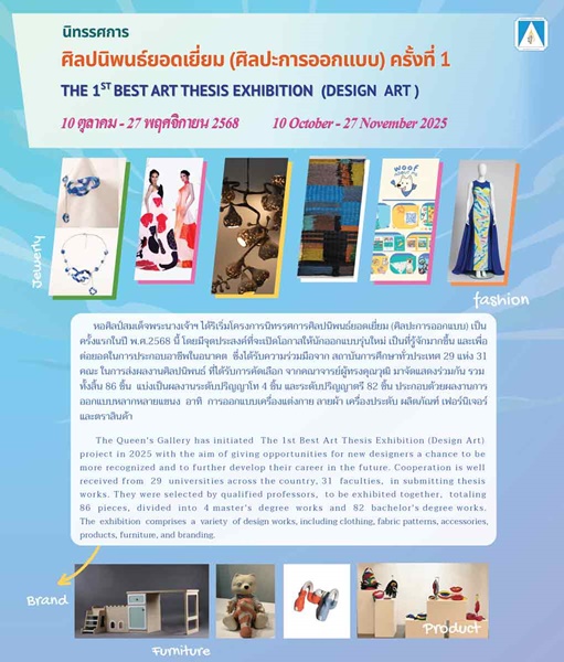 มาร่วมชื่นชมและสนับสนุนผลงานของนิสิต นักศึกษาไปพร้อมๆ กันกับนิทรรศการ “ศิลปนิพนธ์ยอดเยี่ยม (ศิลปะการออกแบบ) ครั้งที่ 1” ตั้งแต่วันที่ 10 ตุลาคม – 27 พฤศจิกายน 2568 ณ หอศิลป์สมเด็จพระนางเจ้าสิริกิติ์ พระบรมราชินีนาถ ถนนราชดำเนินกลาง เปิดให้เข้าชมทุกวัน (ปิดวันพุธ) เวลา 10.00 – 19.00 น.